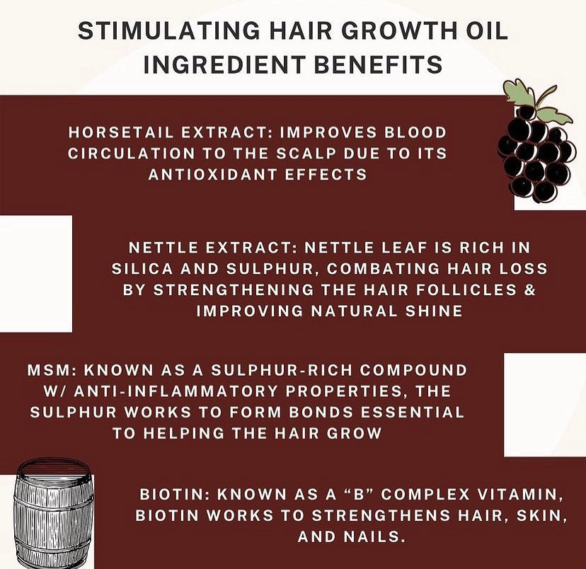 Introducing the new Stimulating Hair Growth oil by Vineyard Curls in a 4oz size option! The Stimulating Hair Growth Oil significantly increases hair growth and works to treat split ends, dandruff, dry & itchy scalp, and heat or chemically damaged hair with every use. Each ingredient such as Jojoba Oil, Jamaican Black Castor Oil, Neem Oil, Nettle extract, and Horsetail Extract is thoroughly combined to give you stronger, healthier hair while also providing the irresistible aroma of Peach Bellini for a pleasant styling experience.